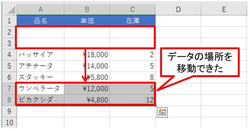 - ドラッグ移動する行が、他のセルと合致しないようにしてください。