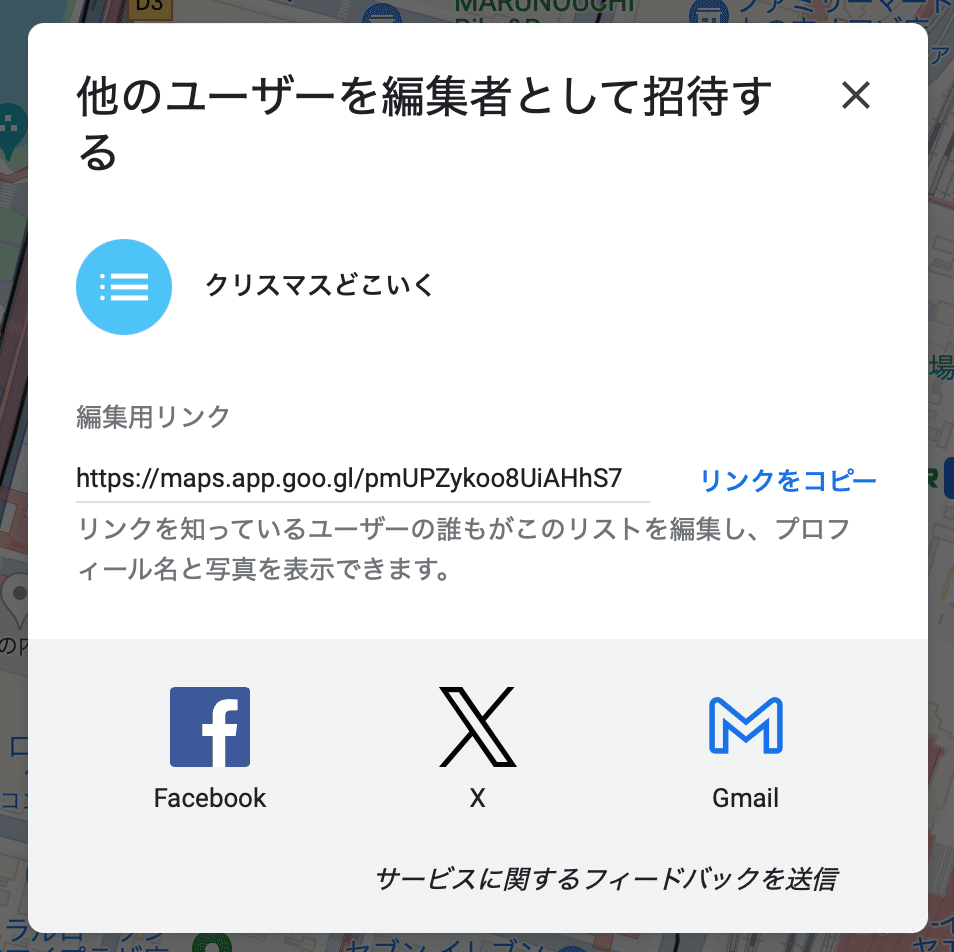 - 共有するマップの URL をコピーし、共有先に貼り付ける必要があります。